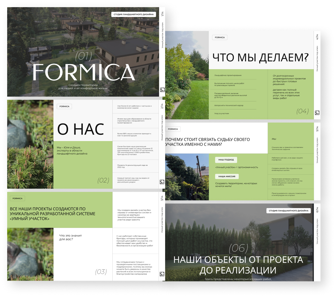Презентация для студии ландшафтного дизайна. В стильном и лаконичном дизайне представлена информация о студии, необходимая для потенциальных заказчиков, некоторые проекты, контактные данные