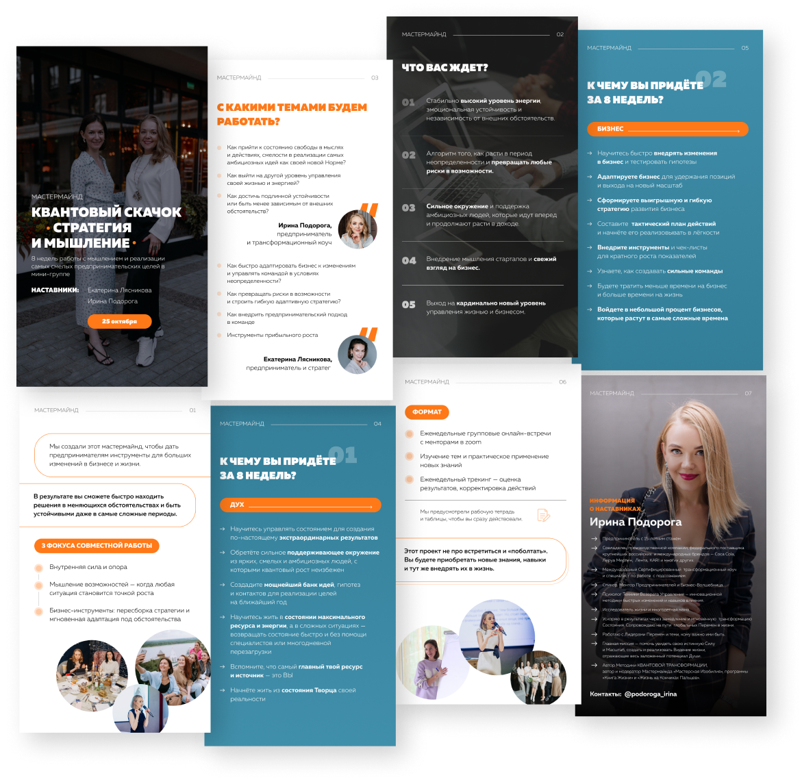 Презентация для бизнес-ретрита. Идет обсуждение продукта для предпринимателей по реализации своих целей в группах